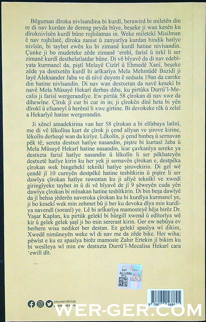 Elbet di xwendina her destxeteke kevin da em rasti hinek astengiyan tên, bi taybeti pisti borîna zêdetir ji 100 salan gelek peyv niha nayên bikaranîn an jî ew peyv in ku koka wan ji zimanên derdorê ne. Ji ber hindê ev destxeta ku bi kurdîya kurmancî ye, ji bo kesekî wek min zehmet bû ji ber ku devoka dîya min kurdîya navendî (soranî) ye. Lê bi arikarîya mamosteyê hêja birêz Dr. Yaşar KAPLAN, ku pirtûk gelekî bi hûrgilî xwend û editoriya wê kir û gelek gelek şaşî ji bo min sererast kirin. Ger ew nebûya ev berhem wisa nediket ber destan. Ez geleki spasîya wî dikim, Xwedê nimûneyên weke wî di nav me da zêde bike. Her wiha; pêwîst e ku ez spasiya birêz mamoste Zahir ERTEKIN jî bikim ku bi wesîleya wî min ew destxeta Durrû’ I-Mecalisa Hekarî cara ewilî dît.